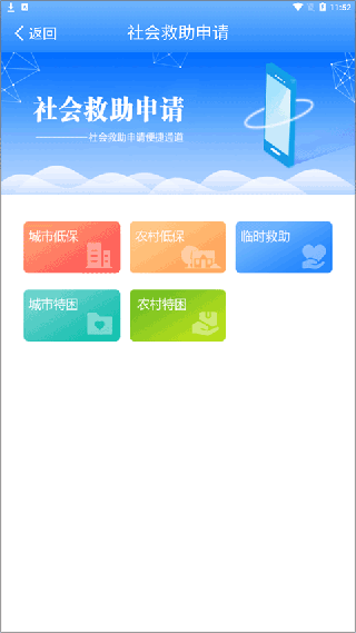 1、進(jìn)入軟件主頁面,點擊低保查詢。進(jìn)入之后點擊臨時救助。