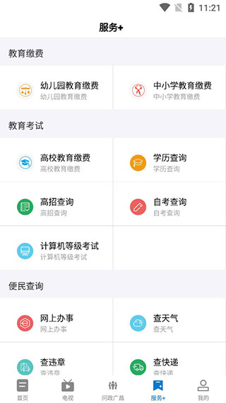 1、打開軟件后,在“服務(wù)+”界面,選擇繳費類型,例如:幼兒園、中小學(xué)、高校教育等。