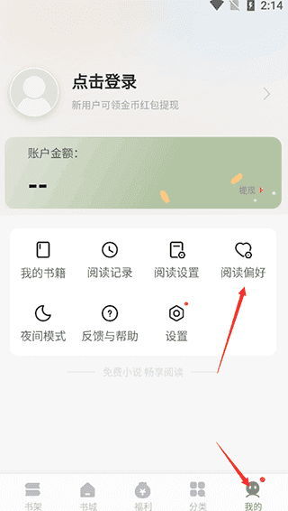 3、若您希望App為您推送特定的小說,可點(diǎn)擊右下角的“我的”,然后選擇“閱讀偏好”進(jìn)行設(shè)置。