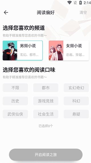 4、進(jìn)入“閱讀偏好”后,您可以根據(jù)個(gè)人喜好進(jìn)行個(gè)性化設(shè)置,讓App更好地為您推薦合適的書籍。